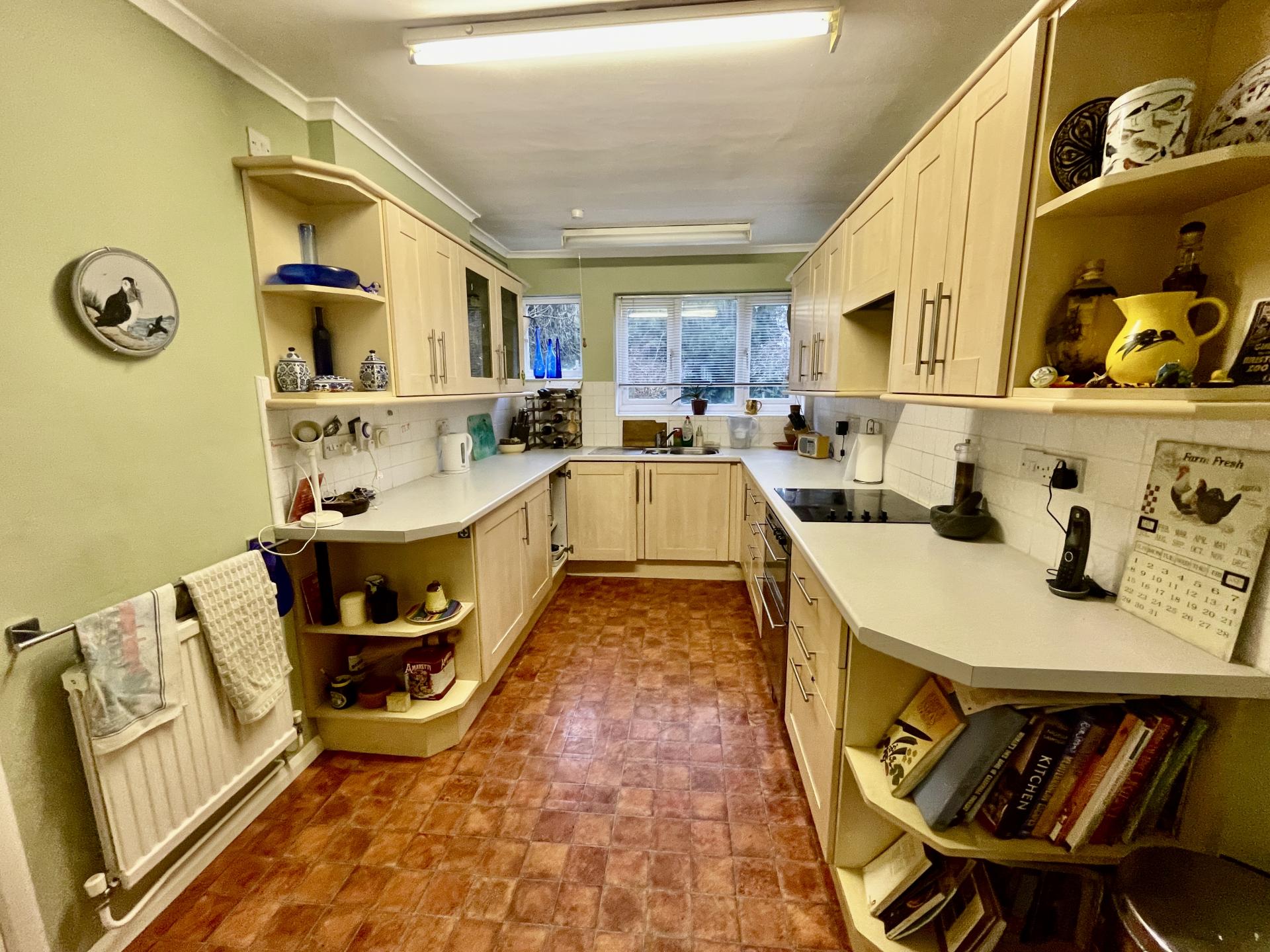KITCHEN 7' 11" x 15' 3" (2.42m x 4.65m) 2 UPVC double glazed windows to the rear elevation, skimmed ceiling, 2 strip lights, double radiator, door into PANTRY with shelving, coat rail and lighting. The kitchen is fitted with a wide range of base and eye level units with work surfaces over, tiled splashbacks, drawer units, integrated ceramic hob, integrated double fan assisted stainless steel electric oven, built-in extractor hood over, integrated fridge, display cabinets, door to: