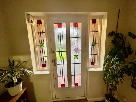 ACCOMMODATION Open porch with quarry tiled flooring, skimmed ceiling, lighting and through a wooden obscured leaded door with decorative glass into: