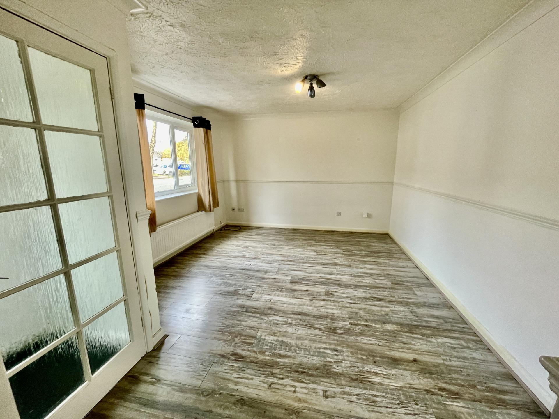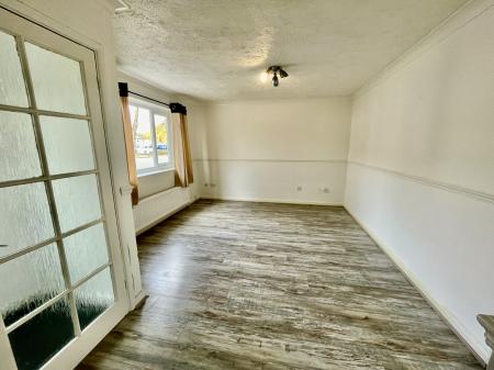 LOUNGE 11' 8" x 17' 3" (3.56m x 5.26m) at the widest point. UPVC double glazed window to the front elevation, coved and textured ceiling, laminate plank flooring, centre light point, double radiator, TV point, dado rail, understairs storage cupboard housing electric consumer unit board and shelving. Door into: