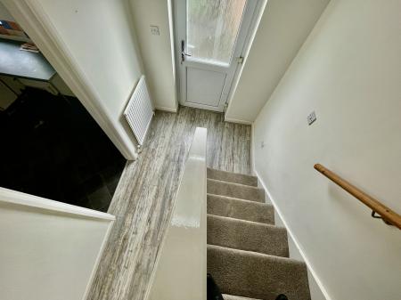 INNER HALLWAY 5' 8" x 9' 7" (1.75m x 2.93m) Obscured UPVC double glazed door to the rear elevation, coved and textured ceiling, centre light point, radiator, laminate plank flooring, staircase rising to first floor. Door to: