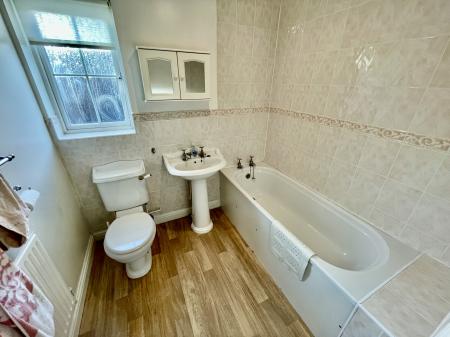 BATHROOM 6' 3" x 6' 11" (1.93m x 2.13m) Obscure Georgian effect UPVC double glazed window to the side elevation, coved and textured ceiling, centre light point, extractor fan, part tiled walls, medicine cabinet, radiator, fitted with a three piece suite comprising low level WC, pedestal wash hand basin with taps and bath with fitted taps.