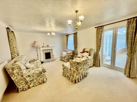LOUNGE 19' 0" x 13' 2" (5.81m x 4.02m) UPVC window to the rear elevation, UPVC window to the front overlooking the porch, 2 radiators, 2 ceiling lights, coal effect gas fire with decorative surround, coved and textured ceiling, UPVC double doors to: