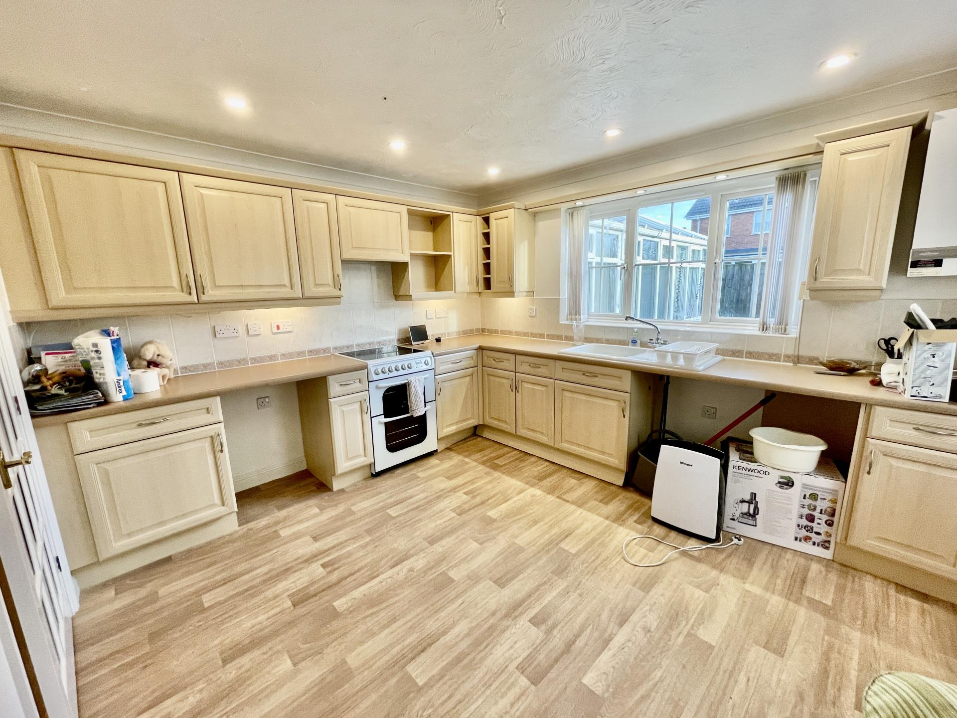 DINING KITCHEN 11' 5" x 11' 10" (3.49m x 3.62m) Range of fitted units comprising base cupboards and drawers, intermediate wall tiling, eye level wall cupboards with under lighters, worktops with inset single drainer sink unit with mixer tap, plumbing and space for washing machine and dishwasher, freestanding electric double oven and hob with concealed cooker hood, radiator, UPVC window to the rear elevation, recessed ceiling lights, half glazed external entrance door, wall mounted gas fired central heating boiler.