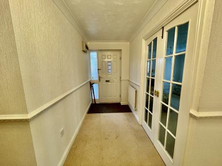 MAIN HALLWAY 14' 0" x 4' 9" (4.28m x 1.46m) Radiator, dado rail, consumer unit, ceiling light, glazed double doors to:
