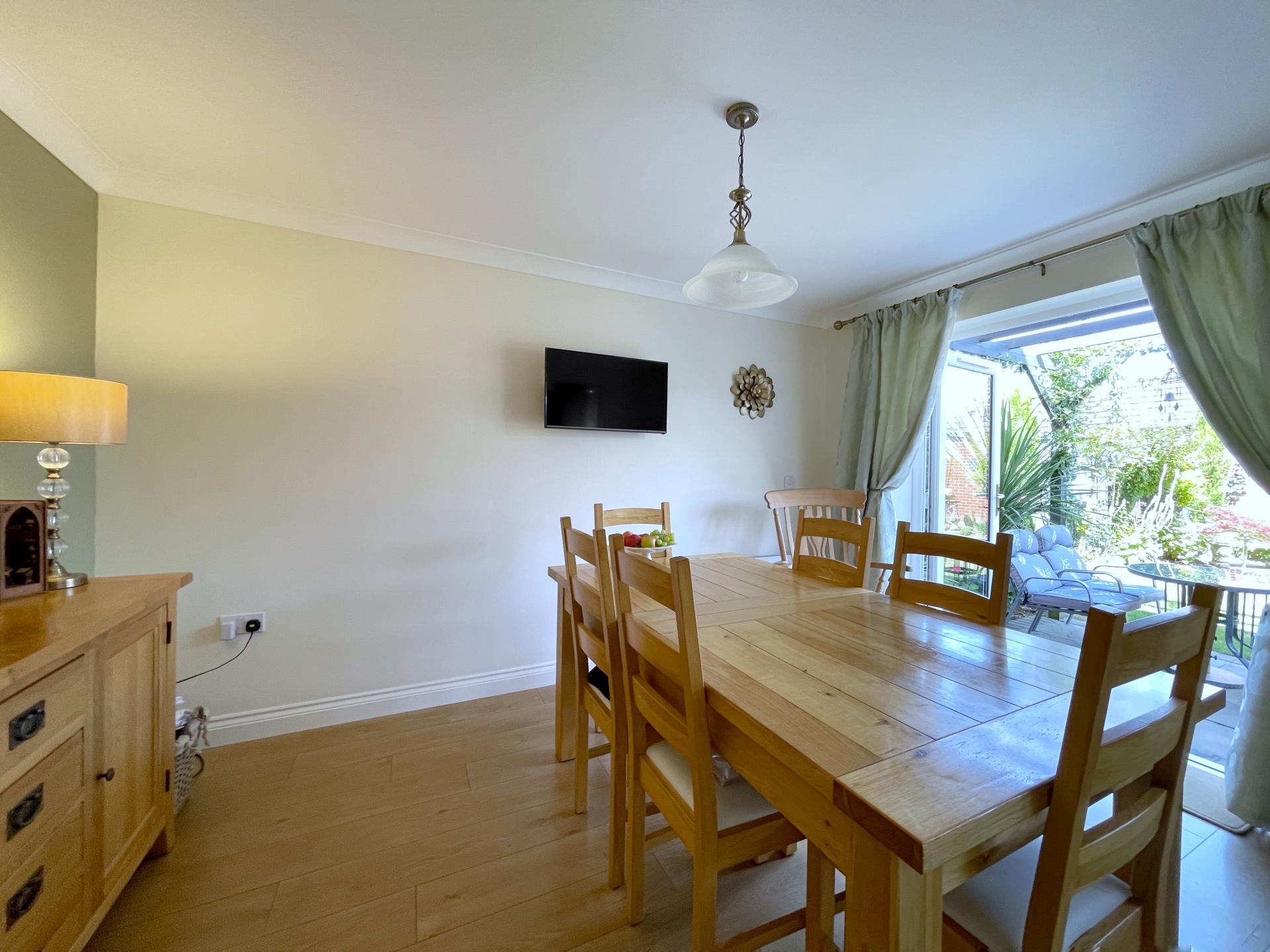 DINING AREA UPVC double glazed French doors to the rear elevation, skimmed and coved ceiling, centre light point, radiator, TV point, oak effect laminate flooring.