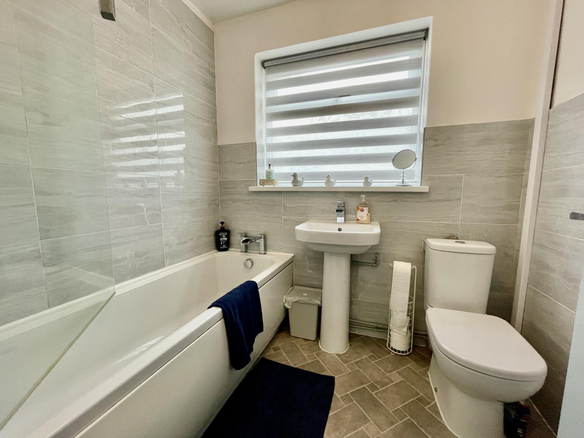 FAMILY BATHROOM 5' 6" x 6' 11" (1.70m x 2.11m) Obscured UPVC double glazed window to side elevation, skimmed ceiling with centre light point, vinyl floor covering, single radiator, part tiled walls and full tiling to bath area, fitted with 3 piece suite comprising low level WC, pedestal wash hand basin with rainfall shower mixer tap, bath with rainfall shower tap, glass shower screen, fitted electric Mira Sport power shower over bath.
