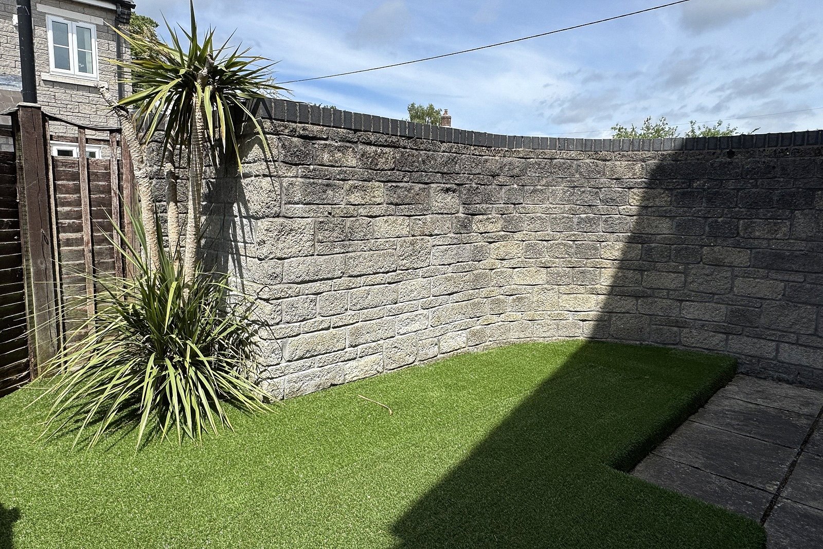 OUTSIDE: Small easy to maintain courtyard style garden laid with artificial grass.