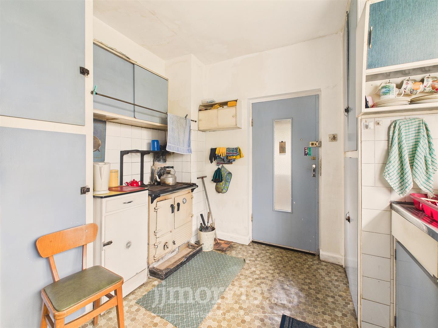 Kitchen - Door to side leading into side porch, a range of wall and base units with work surface over, tile splash back, serving hatch, stainless steel sink and drainer, space for white goods and oven, Rayburn, floor standing oil boiler, fitted shelving.