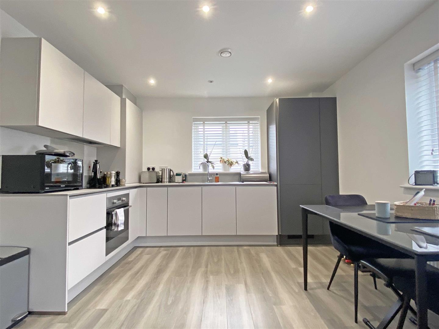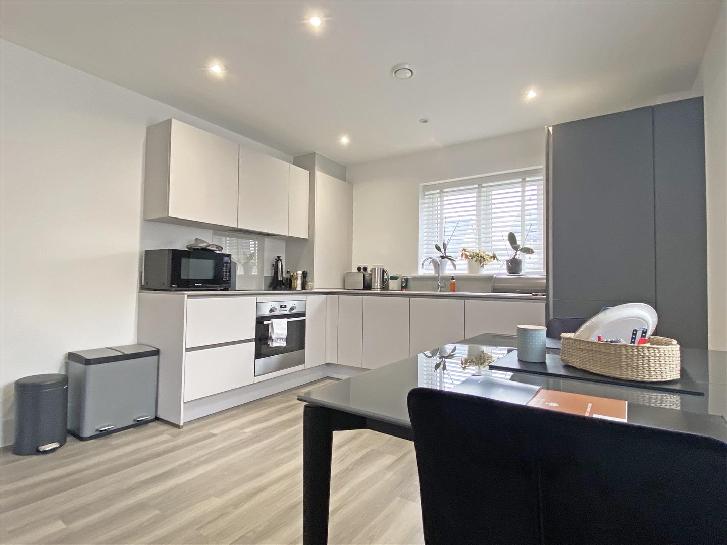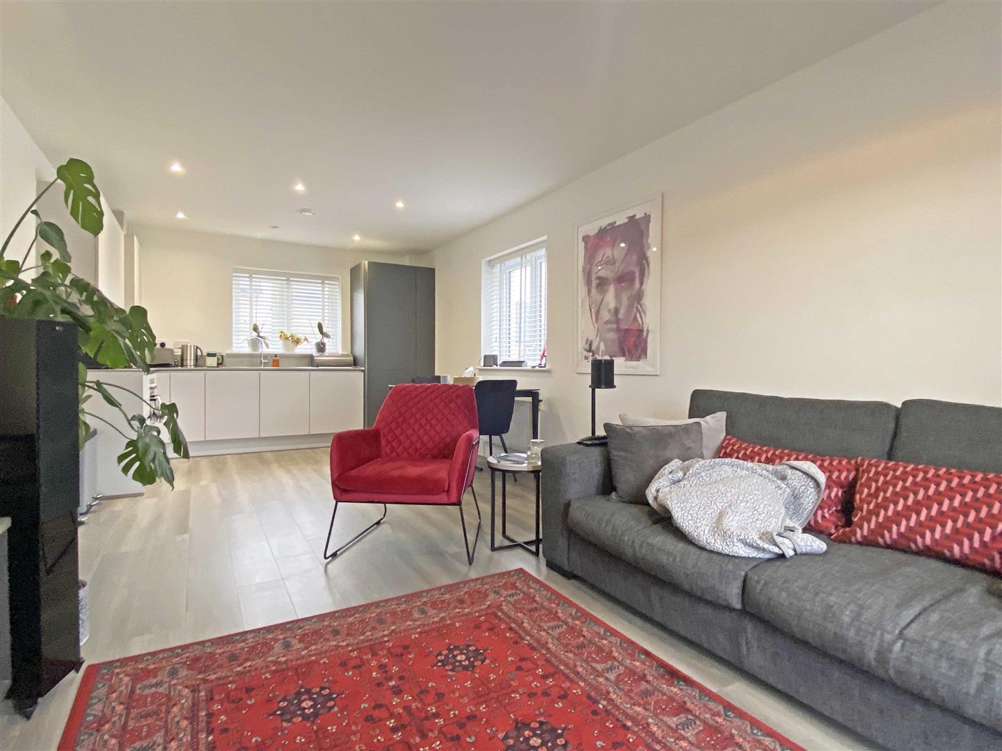 Open Plan Living Area: - 7.52m x 3.51m (24'8" x 11'6") - Triple aspect room, double glazed windows to rear and side, French doors to Juliet balcony, range of wall and base units, square edge work surfaces with stainless steel sink inset, integrated low level oven, induction hob with glass splash back and extractor over, fridge freezer, dishwasher, boiler to cupboard, radiator, Amtico flooring.