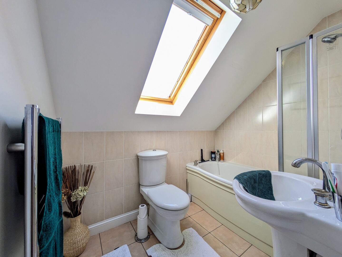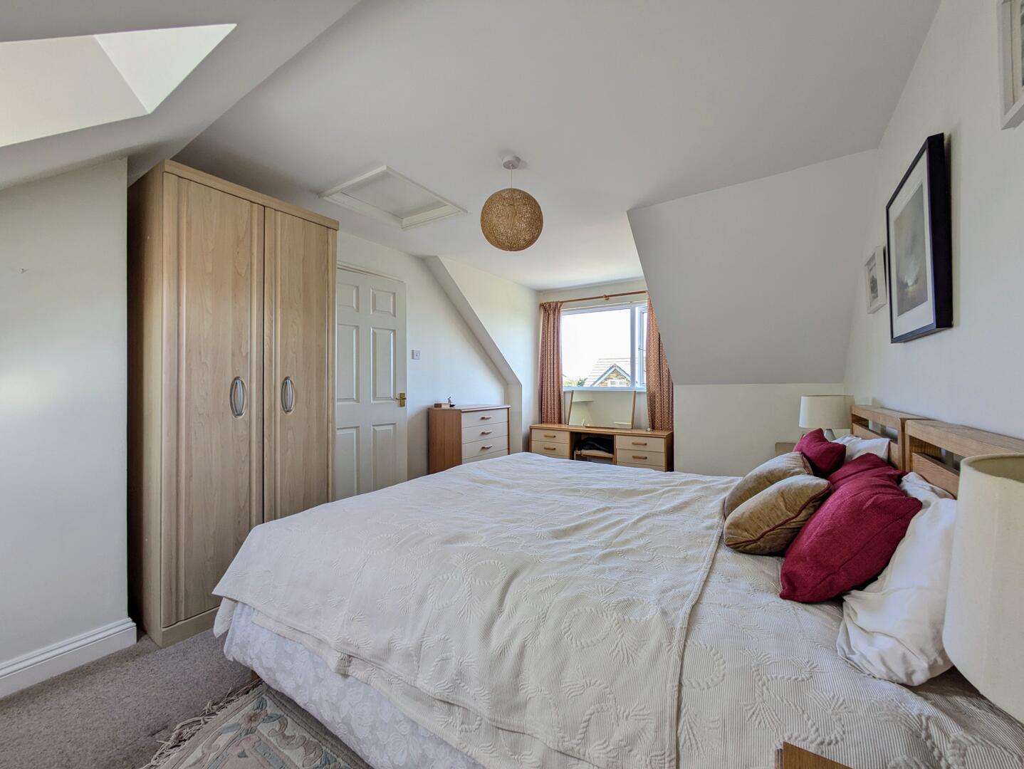 Upstairs comprises an impressive triple-aspect master suite, with eaves storage and an ensuite shower room. The guest bedroom is a dual aspect large double which also utilises the eaves storage. The landing itself is flooded with light from the velux window, it has a useful mirror-fronted storage area, access to bedroom three and the family bathroom.