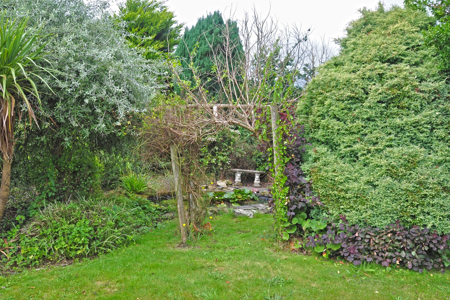 - Colourful garden with shrubs and small pond