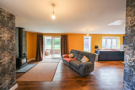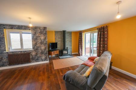 33' 9" x 12' 2" (10.29m x 3.71m) plus the dining area 9' 6" x 10' 4" (2.90m x 3.15m) This room features sliding patio doors opening into the conservatory, along with a wood-burning stove set on a slate hearth and complemented by an attractive slate-tiled feature wall. The dining area also benefits from a side-facing window.