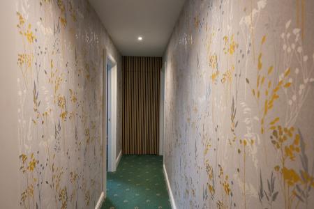 This leads off from the main entrance hall and provides access to the bedrooms. at the end of the hallway is a nicely concealed storage cupboard finished in vertical wood panelling.