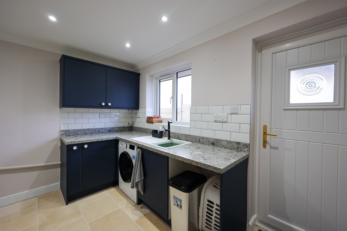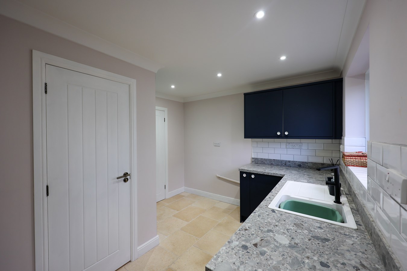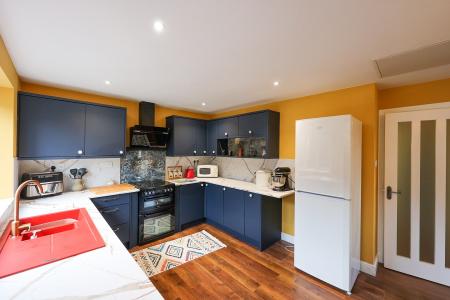 13' 6" x 12' 0" (4.11m x 3.66m) Max, enjoying a hardwearing ceramic tiled floor, refitted with blue fronted units with sink unit, window to the side, part glazed Upvc door leading onto the driveway, space and plumbing for washing machine, radiator, door leading to the potential cloakroom with matching tiled floor and T&G panelling.