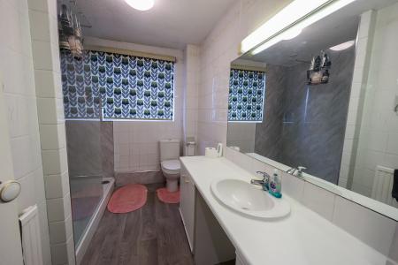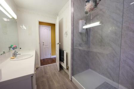 12' 0" x 8' 4" (3.66m x 2.54m) Max this room enjoys a large walk in shower with a glass screen and waterproof vinyl boarding a mira electric shower unit, vanity unit with storage space and cupboards, large fitted mirror, partially tiled walls, window to the side, low level W.C. florescent light fitting, radiator.
