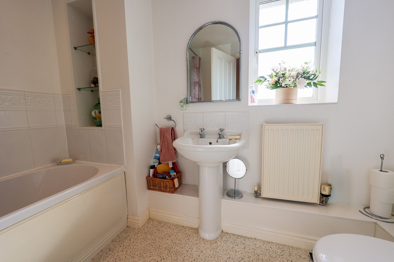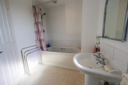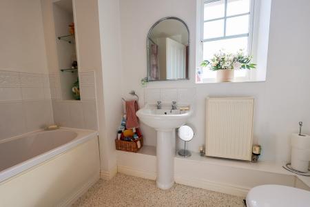 2.6m x 2.0m (8' 6" x 6' 7") narrowing to 1.36, window to the front, panelled bath with built in shower mixer attachment, fully tiled around the bath area, display inglenook, low level W.C wash hand basin.