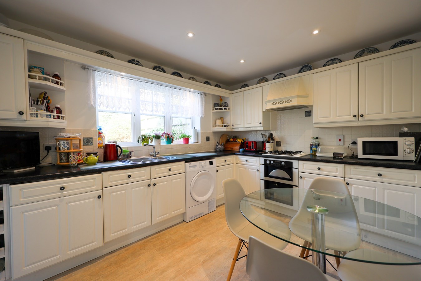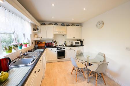 3.6m x 2.9m (11' 10" x 9' 6") Window to the rear, space for table and chairs, well fitted with a good range of base units and high levels, low voltage lighting, space and plumbing for dishwasher, sink unit, double oven, gas hob unit with extractor canopy above, built in fridge and built in freezer, doorway to the utility room.