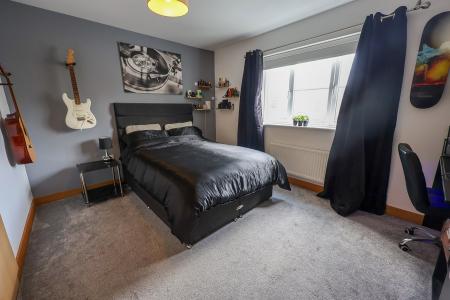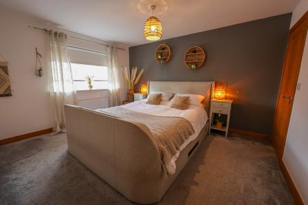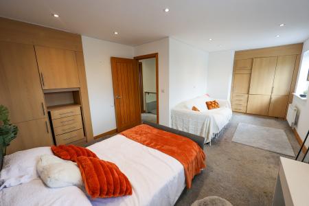 3.69m x 5.98m (12' 1" x 19' 7") This is an L shaped room with two sets of built in wardrobe cupboards, two windows to the front. This room can easily be converted back into two bedrooms if needed.