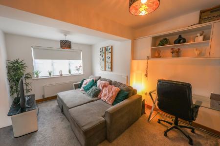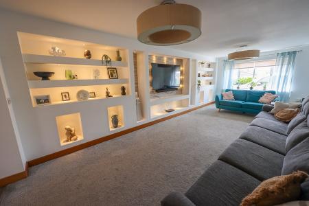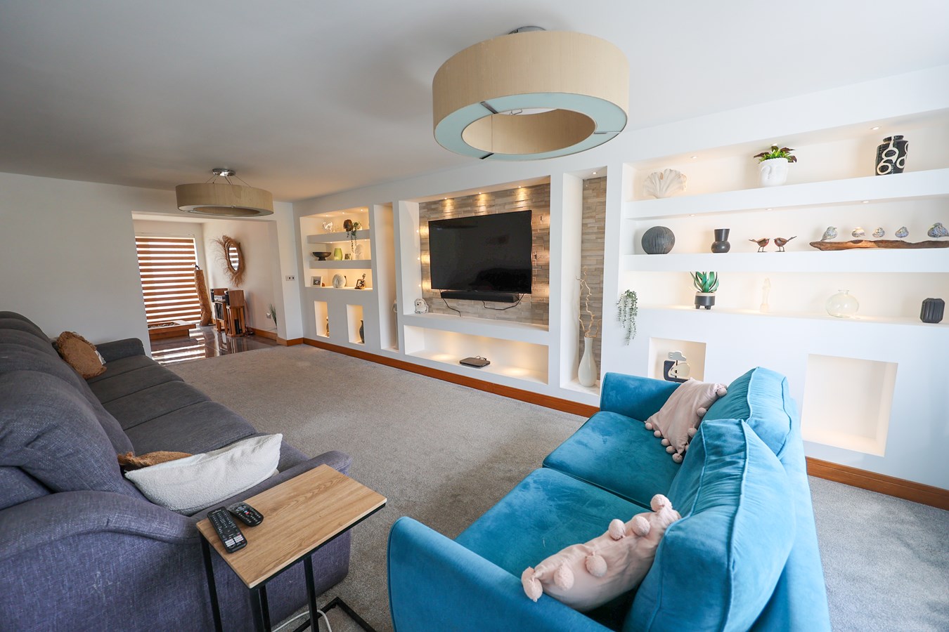 7.4m x 3.94m (24' 3" x 12' 11") A front-facing window brings in natural light, complemented by a striking illuminated media wall with bespoke inglenook-style recesses?perfect for display and entertainment?finished with two stylish wall lights.