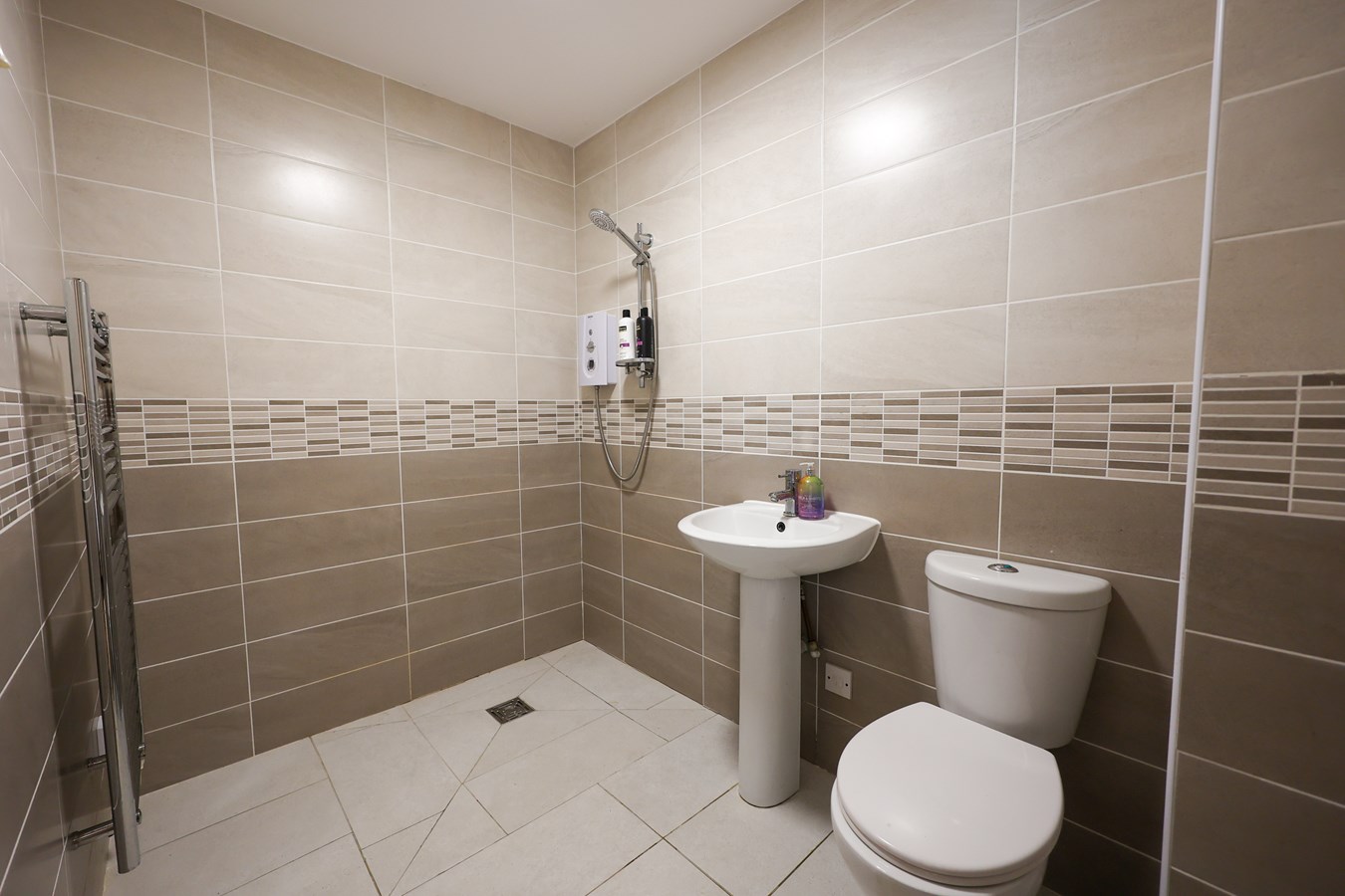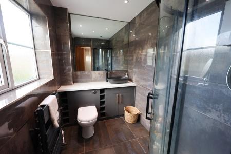 1.64m x 2.3m (5' 5" x 7' 7") Fully tiled walls and floor, electric shower with two shower heads, vertical towel radiator, concealed cistern W.C, vanity unit with basin mounted, large fitted mirror, recess ceiling lighting.