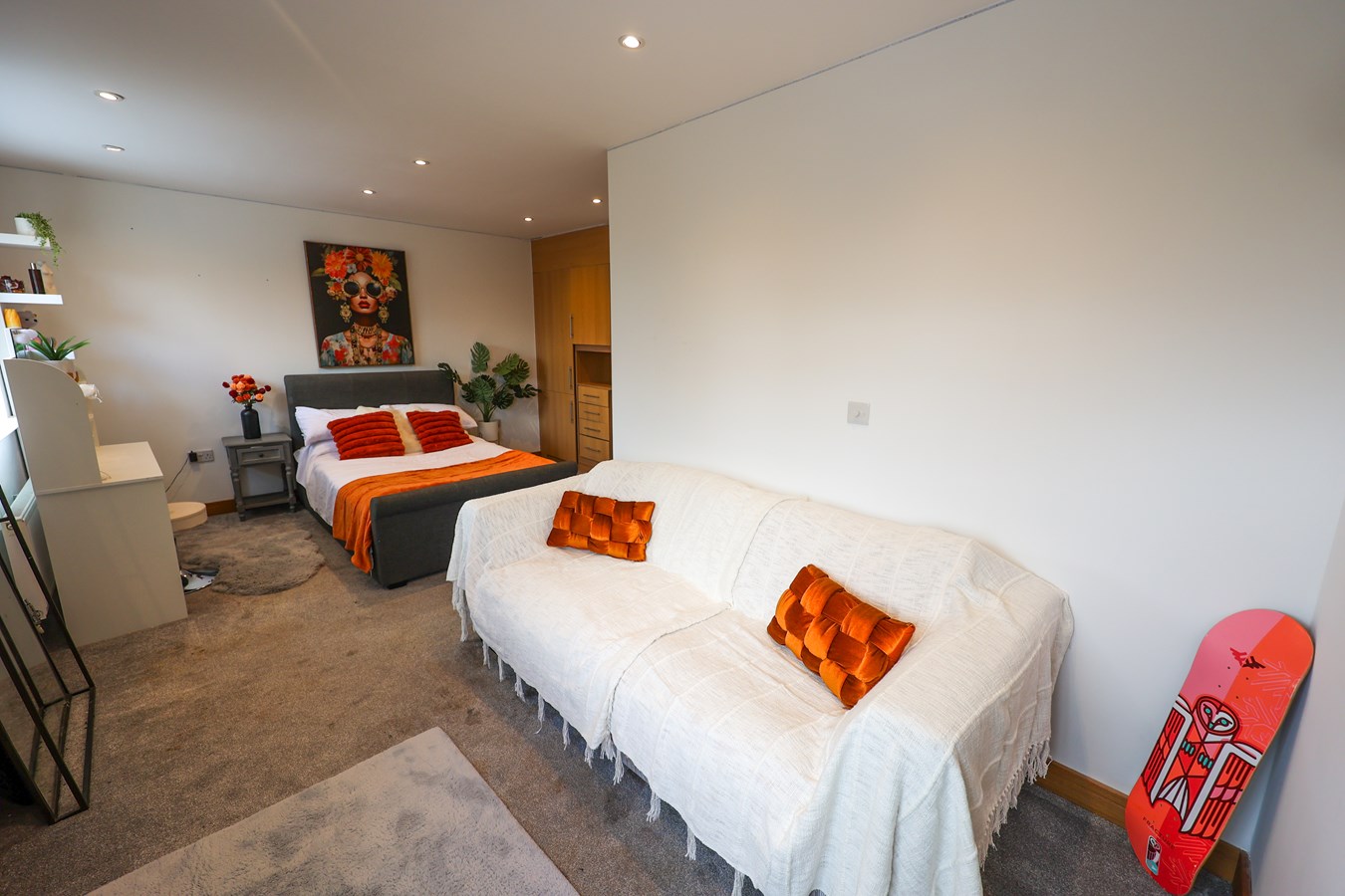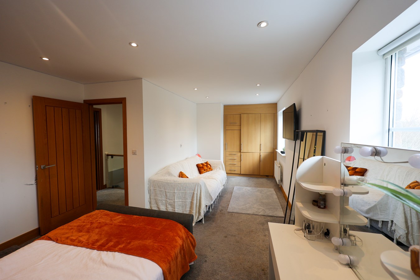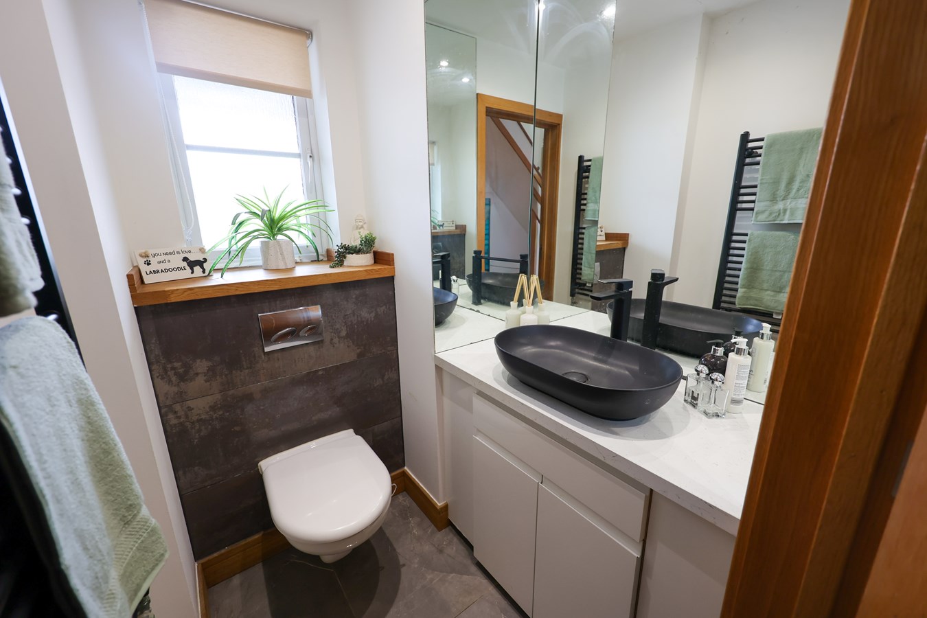Upstairs, you’ll find three spacious double bedrooms, including a standout principal suite with en suite shower room and walk-in dressing room, alongside a family bathroom with separate shower. (Originally designed as four bedrooms, one has been thoughtfully incorporated to enhance space.)