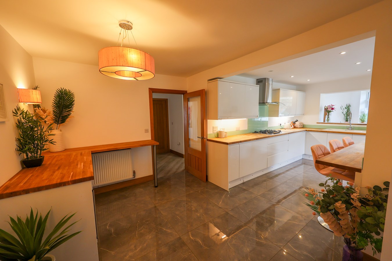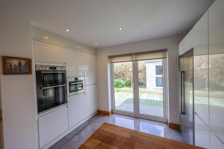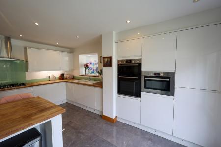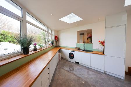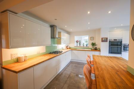 A stunning L-shaped kitchen/breakfast room designed for both style and functionality, featuring a sleek porcelain tiled floor and an extensive range of high-gloss units topped with oak butcher?s block-style work surfaces. A striking coloured glass splashback and enamel sink unit add to the contemporary finish.