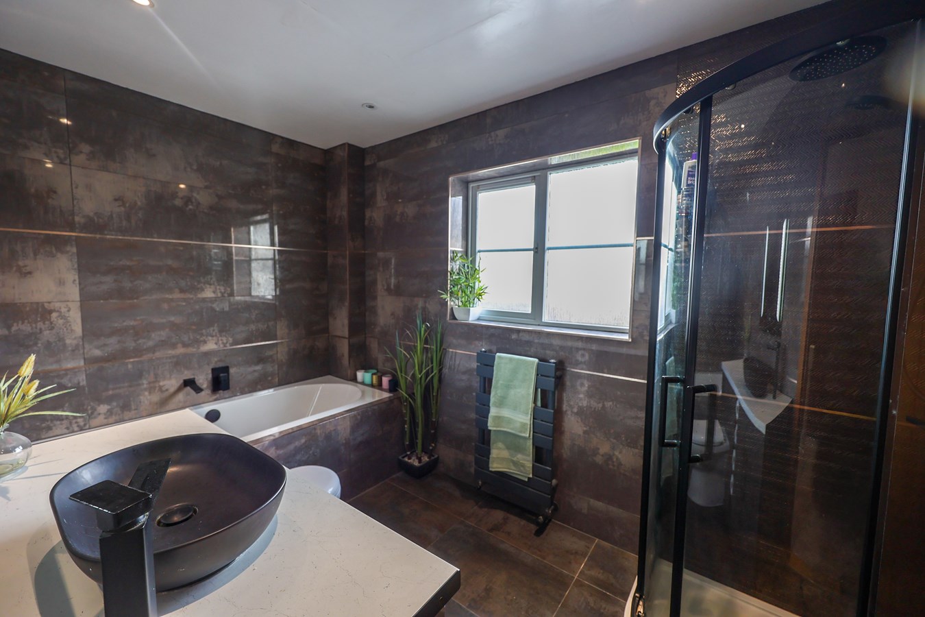 Fully tiled walls and floor, separate shower enclosure, vanity unit with storage and mounted wash hand basin, tiled panelled bath, fitted mirror, window to the front.