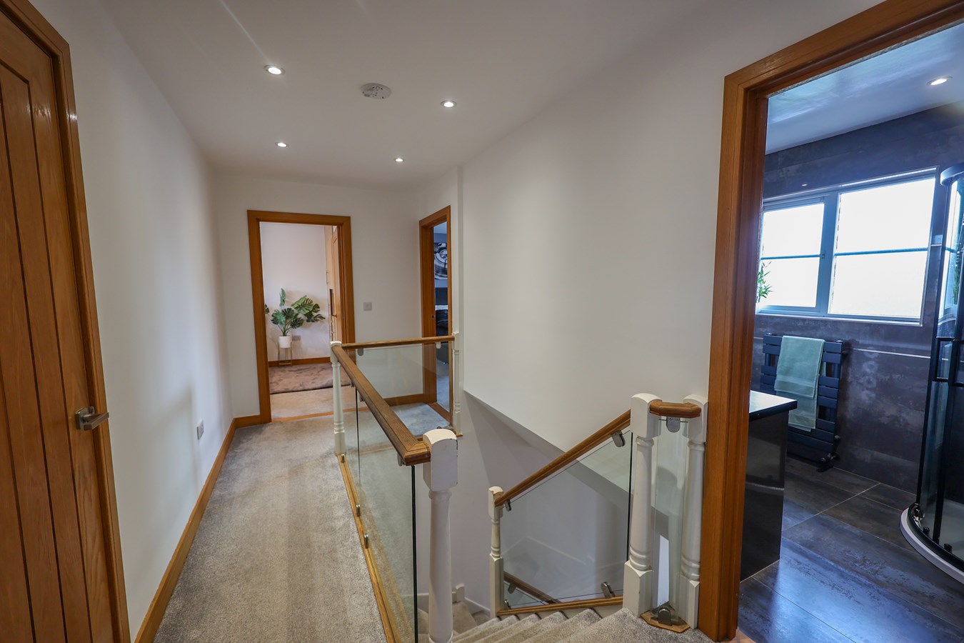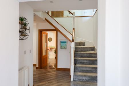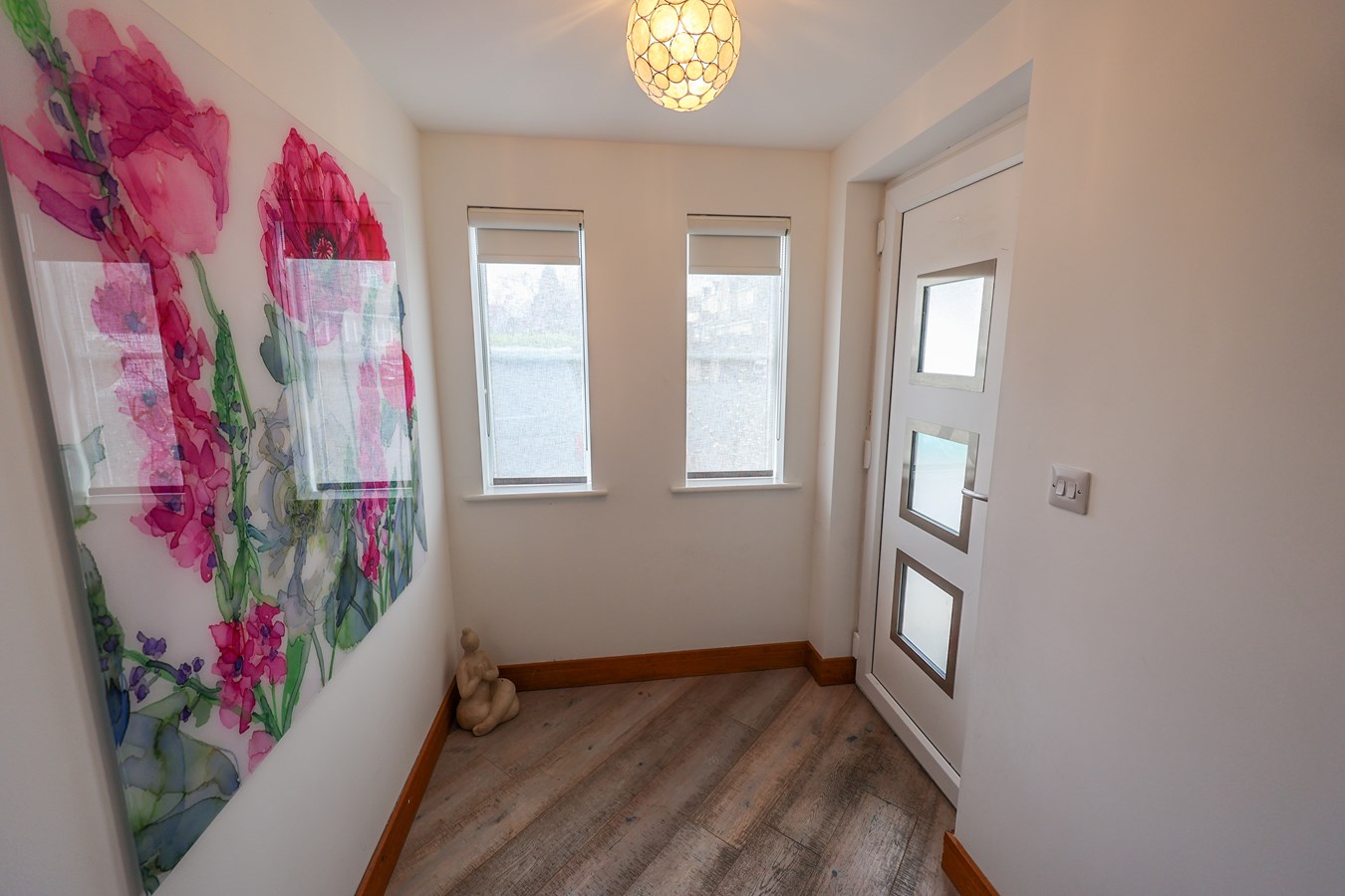 Outside, the property continues to impress with ample parking for 4–5 vehicles and a large, private rear garden backing onto open parkland. Designed for outdoor living, it features a generous slate-paved entertaining terrace, a raised timber barbecue area, lawn, and extensive exterior lighting—perfect for relaxing or hosting in style.Entrance Lobby