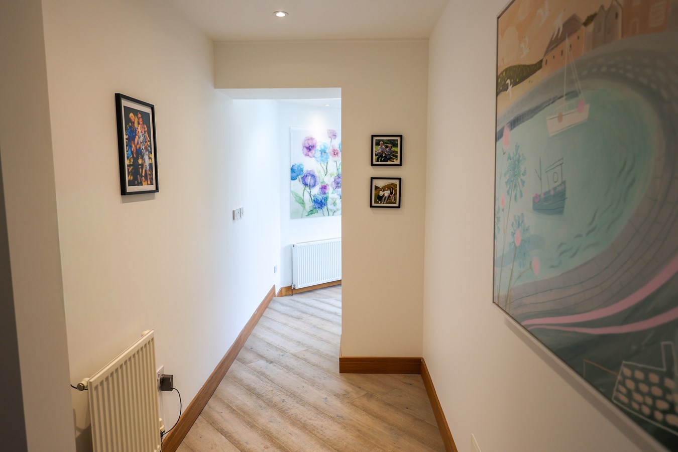 There is a recessed entrance porch leading through to the entrance lobby which then leads through to the entrance hall, with glass and wood staircase to the first floor, under stairs cupboard.