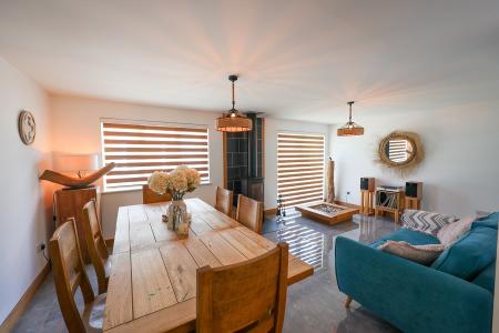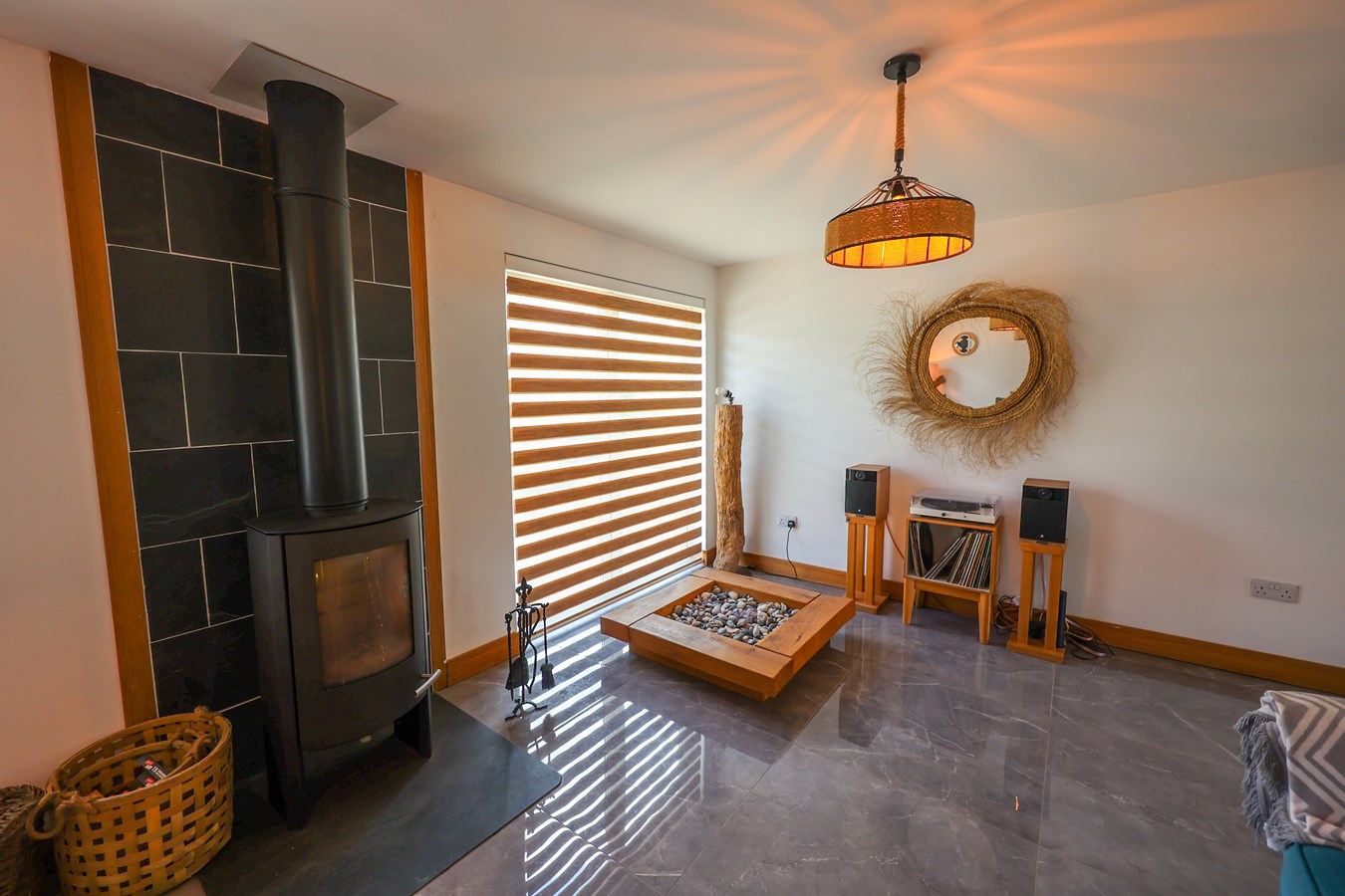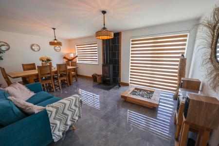 6.0m x 3.6m (19' 8" x 11' 10") Finished with a stylish porcelain tiled floor, this inviting space features a characterful wood burner set against a striking slate feature wall. Large picture windows and French doors to the rear provide a seamless connection to the garden.
