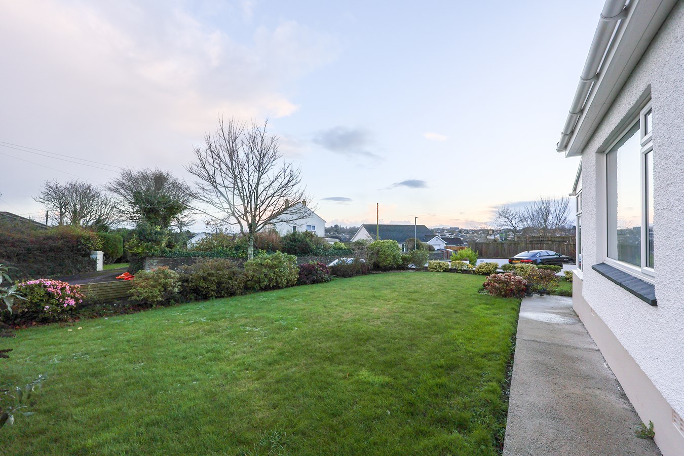 Outside to the front a pillared entrance with tarmac driveway, providing access to the garage. Lovely level lawned garden with shrub borders and wooden fencing. From the front there is a concrete pathway leading to the right hand side of the bungalow, where there is a wide concreted area and golden chipping shrub border. Timber shed. Enclosed level lawned garden.