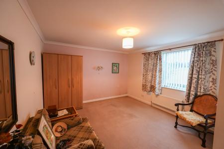 13' 2" x 12' 11" (4.01m x 3.94m) plus door recess. Large window to front. Radiator. Useful built in shelved storage/wardrobe cupboard.