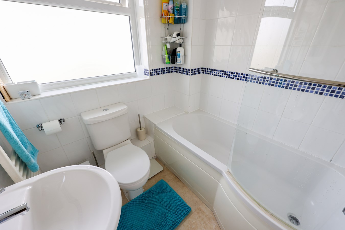 6' 2" x 6' 1" (1.88m x 1.85m) This fully tiled family bathroom is both modern and practical, featuring a double-glazed window to the rear. The white suite includes a stylish P-shaped panelled bath with a shower screen and an electric shower overhead, a low-level WC, and a pedestal wash hand basin. Designed for comfort and functionality, this space is ideal for relaxing and refreshing.