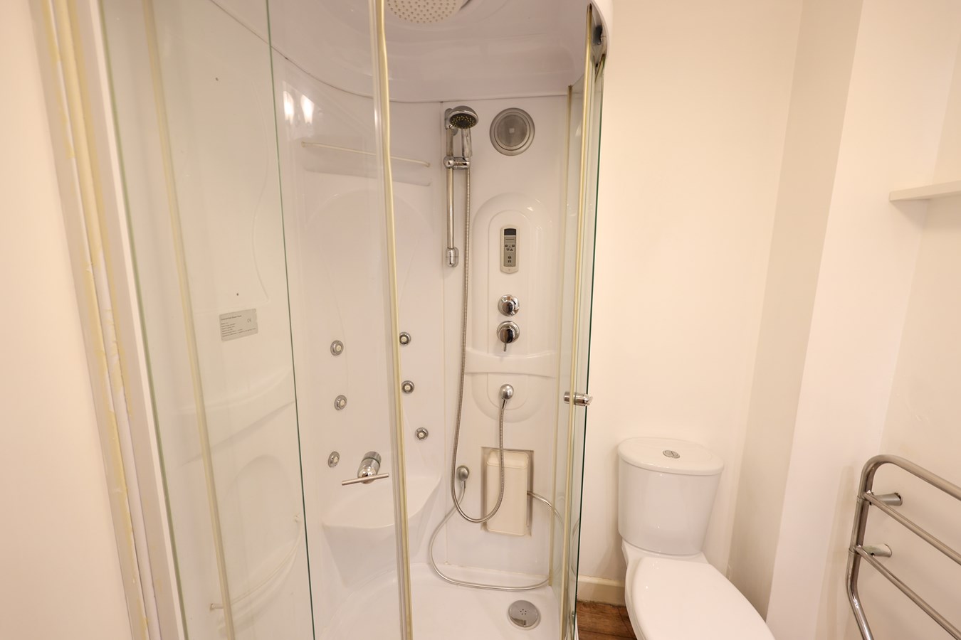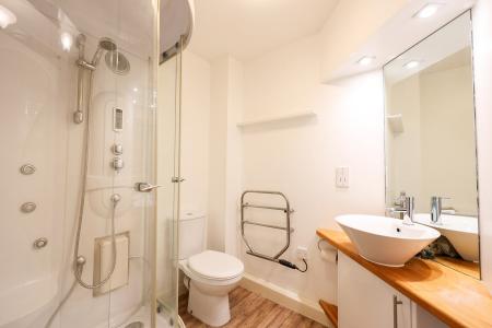 5' 8" x 7' 0" (1.73m x 2.13m) The bathroom is stylishly appointed with a wash hand basin set on a wood-finished workspace with storage below, complemented by two plinth downlighters. It features a low-level WC and a large shower enclosure equipped with body jets, twin shower heads, and a built-in music system. An electric towel radiator, shaver socket, and extractor fan complete the space, ensuring comfort and convenience.