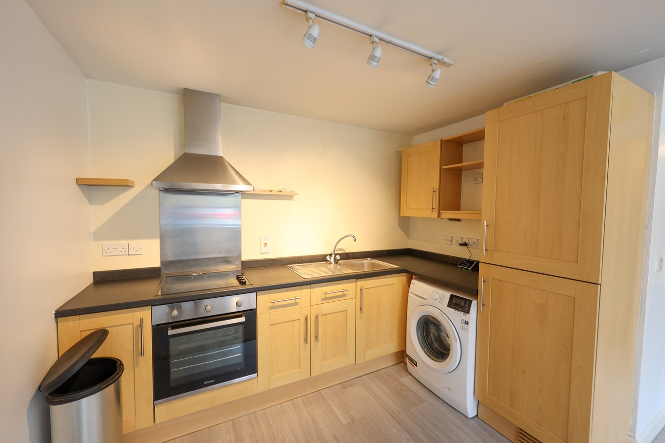 6' 6" x 9' 6" (1.98m x 2.90m) The kitchen is well-appointed with a range of light wood-fronted units, complemented by a built-in oven, a four-ring hob, a stainless steel splashback, and a stainless steel extractor. There is also space and plumbing for a recently installed washing/drier, along with a built-in fridge/freezer for added convenience.
