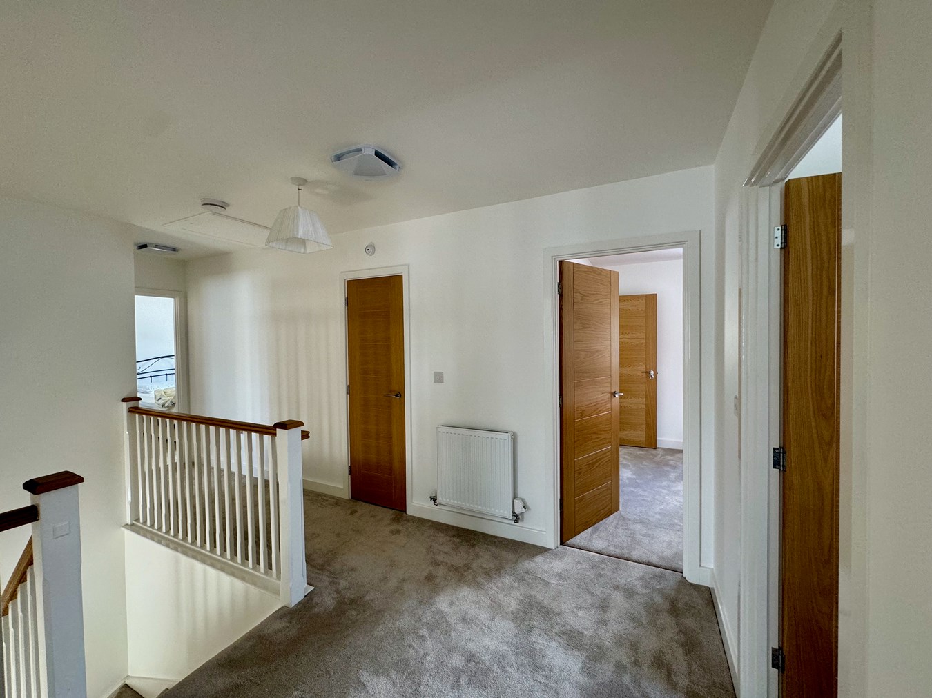 Carpeted stairs lead to gallery landing with bedrooms and bathroom off