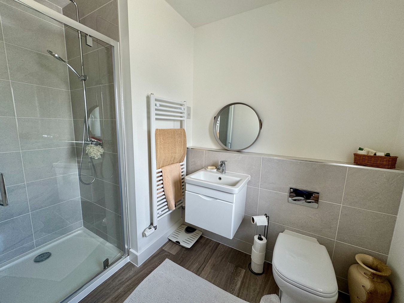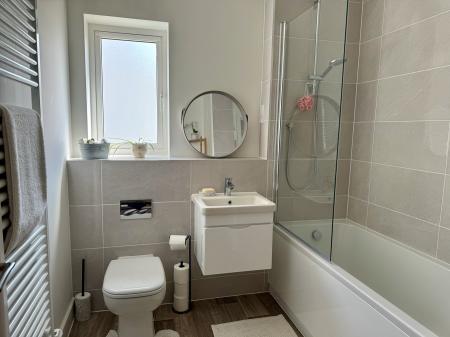 Light and spacious family bathroom with concealed dual flush cistern toilet, handbasin, bath with screen and gas heated shower unit over