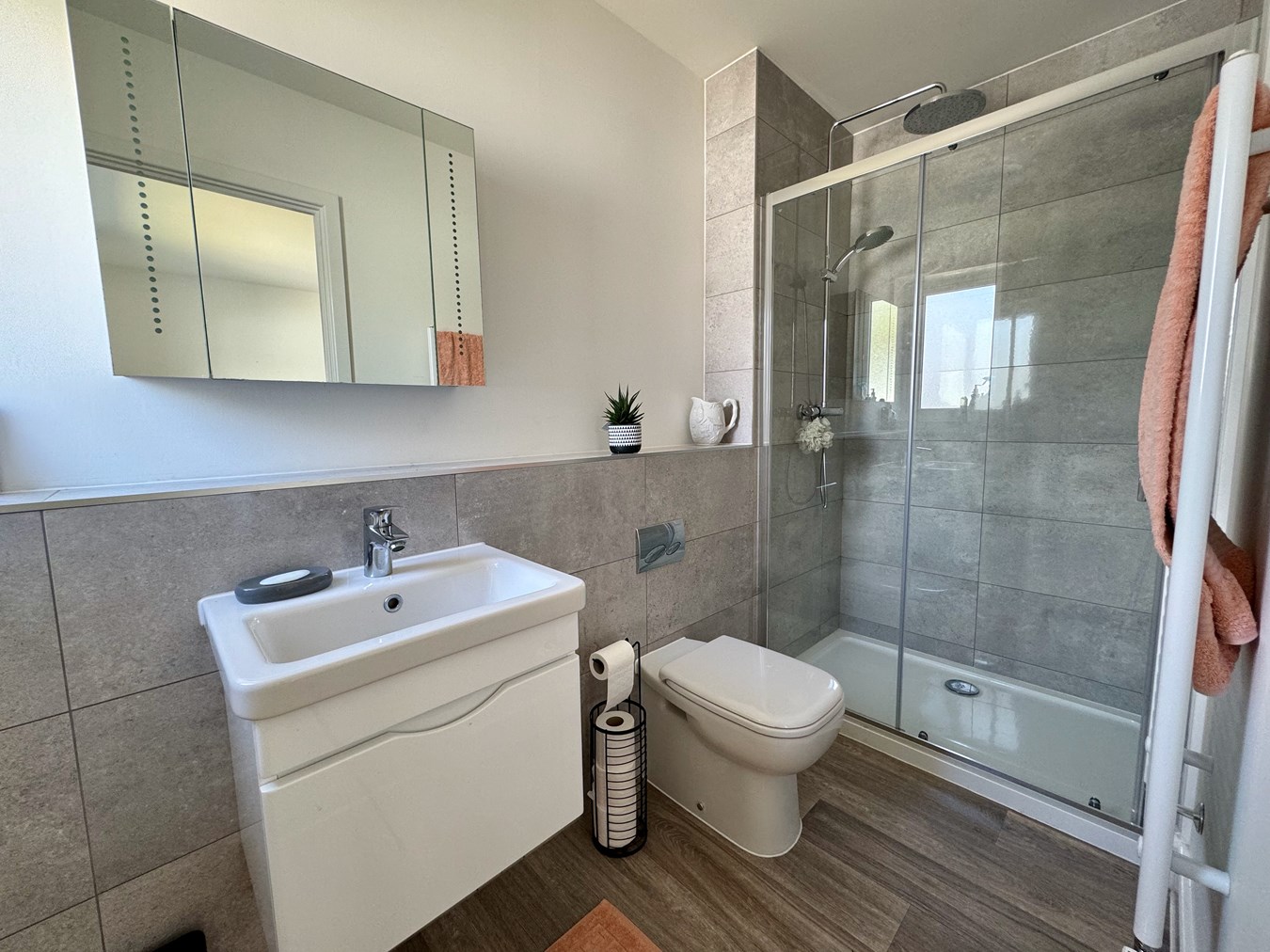 Hand basin, concealed dual flush cistern toilet and walk in gas heated shower with drencher