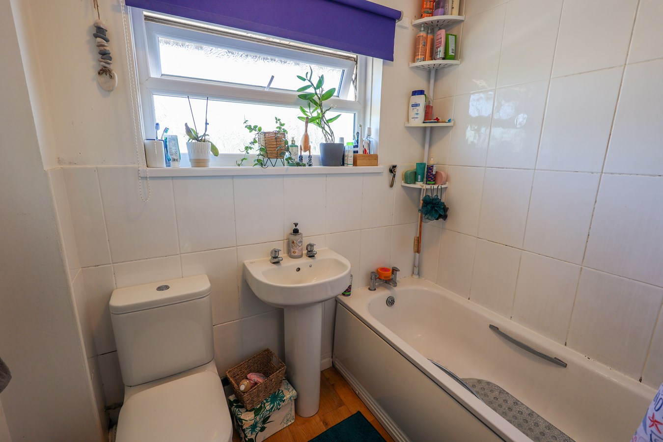 (6' 11" x 5' 6") 2.1m x 1.68m Fitted with a White three piece suite comprising, panelled bath, low level W.C. wash hand basin, partially tiled walls, window to the rear.