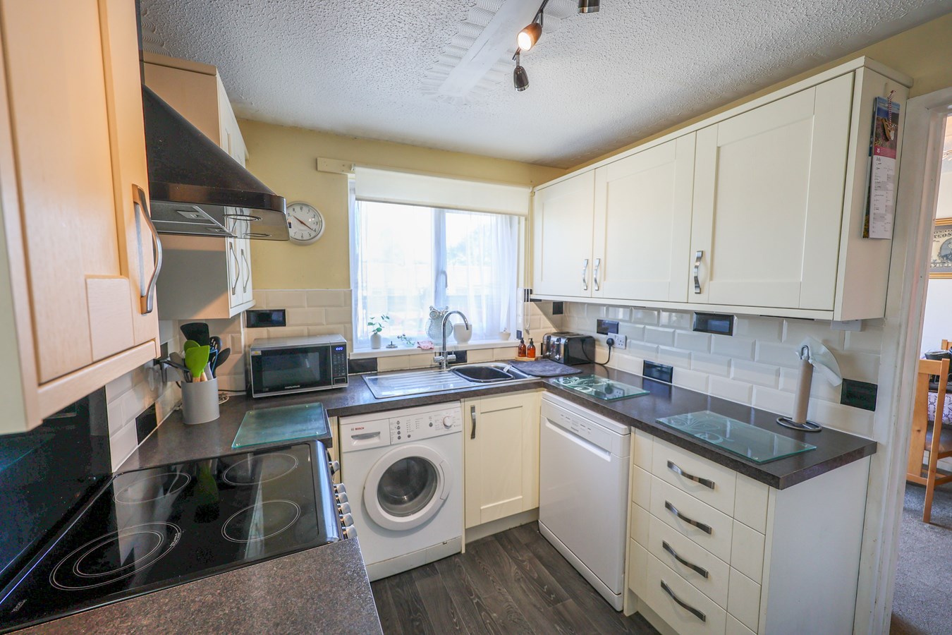 (10' 8" x 7' 9") 3.25m x 2.36m Nicely fitted with a range of cream coloured fronted base units and high level cupboards with white tiled splashback, oven, hob and extractor, space and plumbing for washing machine and dishwasher, window to the rear, half glazed door to the side.
