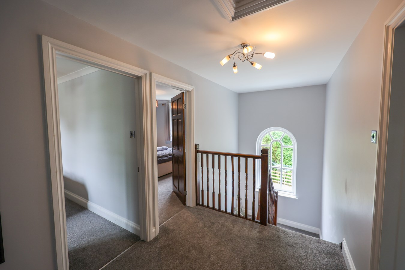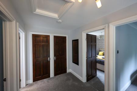 16' 6" x 6' 3" (5.03m x 1.91m) A charming small-paned arched window illuminates the main landing area, which provides roof access and features two generously sized built-in cupboards for ample storage.