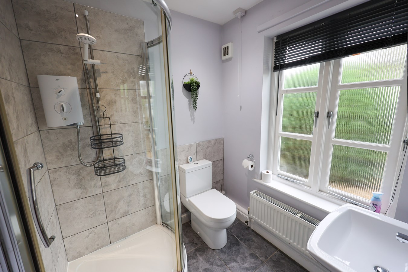 8' 8" x 5' 6" (2.64m x 1.68m) The front-facing window brightens the space, which features a corner shower cubicle with a Mira shower unit, a low-level WC, and a wash hand basin. Recessed low-voltage lighting enhances the ambiance, complemented by an extractor fan and a convenient shaver socket.