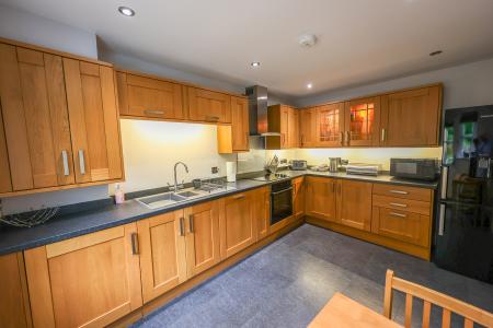 8' 9" x 12' 10" (2.67m x 3.91m) The kitchen features stylish light oak-effect units, complemented by a one-and-a-half bowl sink, a built-in Neff dishwasher and oven, a Bosch induction hob, and a Zanussi extractor with a sleek glass splashback. Glazed display high-level cupboards and chrome furniture add a touch of elegance, alongside low-voltage ceiling and plinth lighting. There?s space for a fridge freezer, and a half-glazed door and rear window invite natural light. An under-stair cupboard provides practical storage, including room for a tumble dryer.