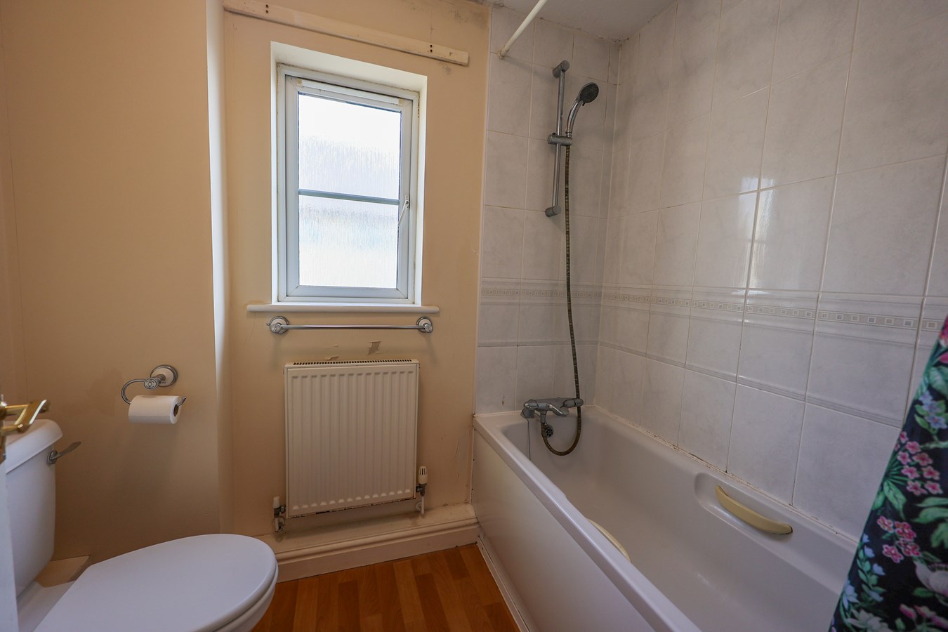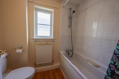 Part tiled walls. Fitted suite of panelled bath with shower over, pedestal wash basin and WC. Radiator. Double glazed window to side.