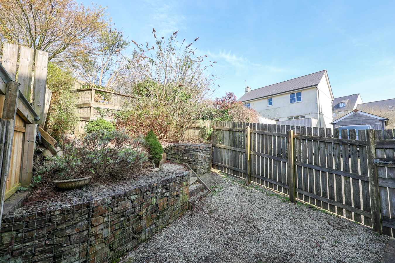 The enclosed rear garden offers a private and versatile outdoor space. French doors from the dining area open onto a level, gravelled courtyard?perfect for relaxing or summer barbecues?while steps lead up to a raised decked area.