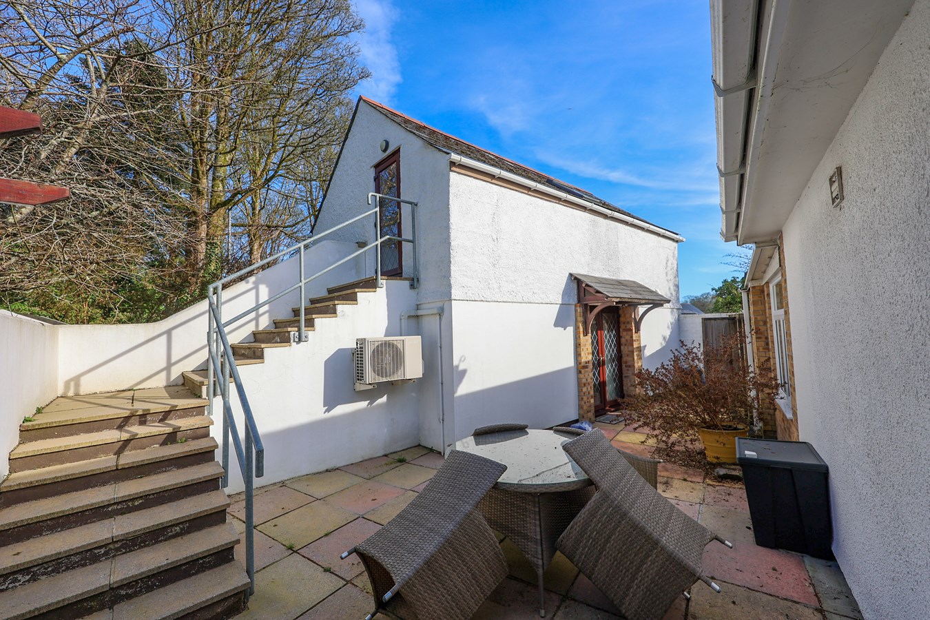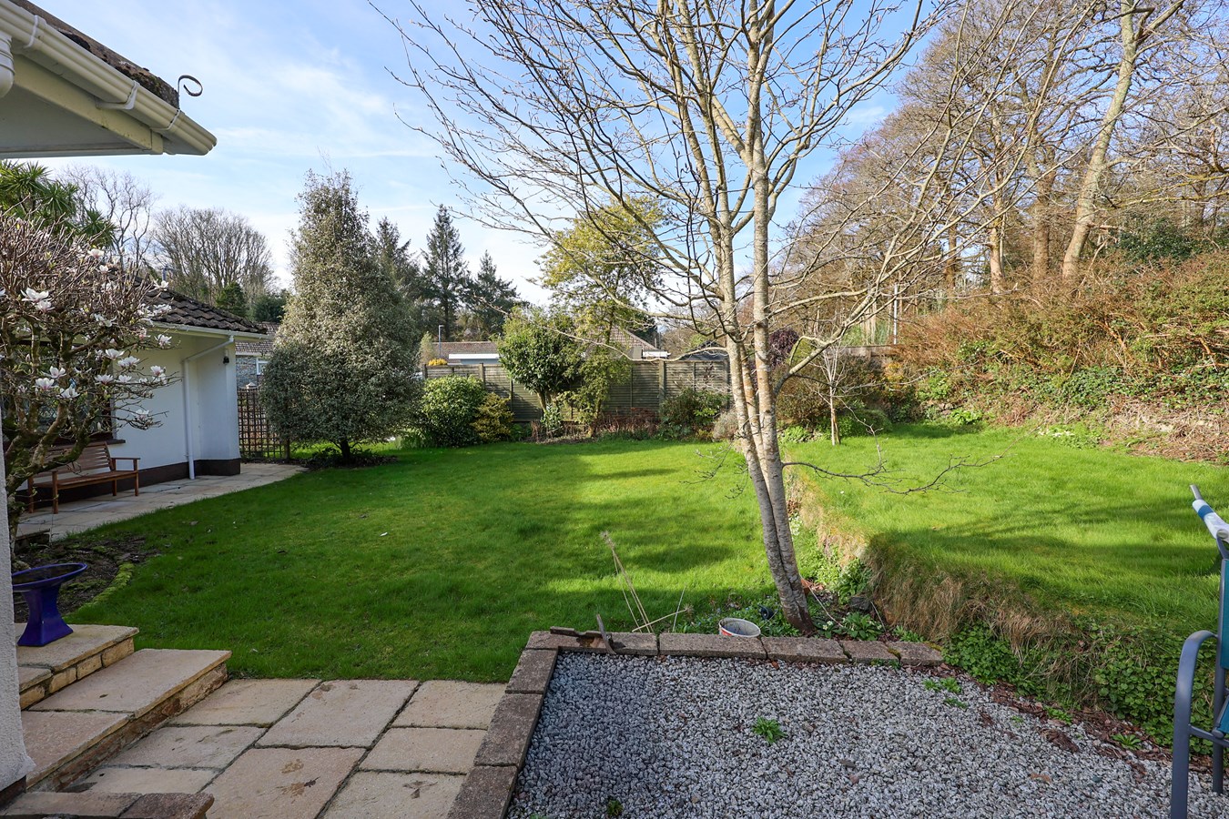 To the rear, there is a raised patio with a short flight of steps leading down to a natural gravelled garden, from which there is access to the side of the garage. The gardens to the front, side, and rear all enjoy a good degree of privacy.