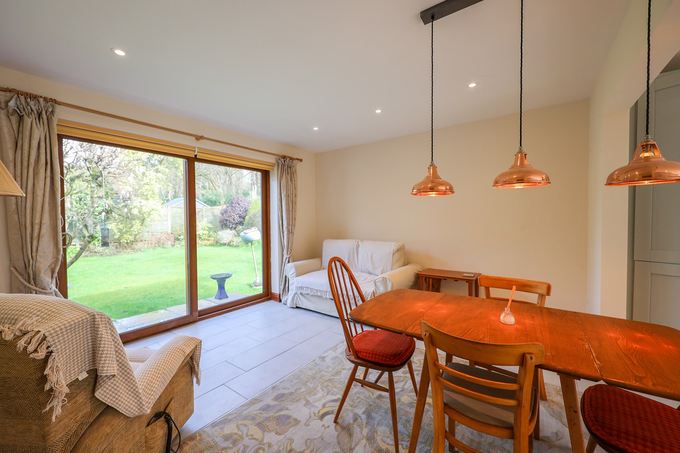Dining Area 4.2m x 3.49m (13' 9" x 11' 5") The dining area enjoys patio doors opening onto the front garden, along with a ceramic tiled floor and low-voltage lighting. It is partially divided from the kitchen/breakfast room,