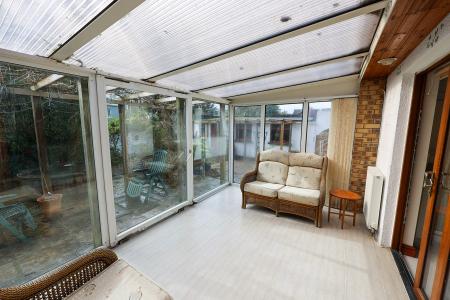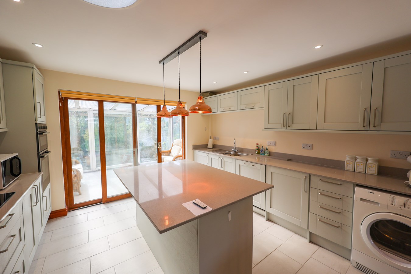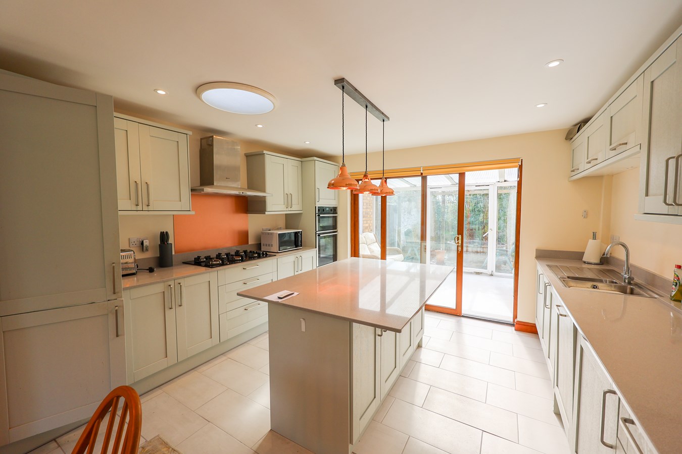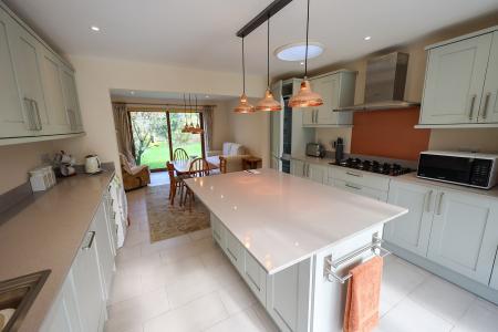 Kitchen/Breakfast Area 4.2m x 3.39m (13' 9" x 11' 1") which has been beautifully refitted with an extensive range of units featuring woodgrain-effect fronts and complementary quartz work surfaces. At the heart of the kitchen is a striking island unit, offering both seating and additional storage?perfect for casual dining and socialising. High-quality integrated appliances include a fridge and freezer, six-ring gas hob, Neff extractor, double oven, dishwasher, and washing machine. Sliding patio doors lead through to the conservatory, while a skylight above enhances the sense of light and space.