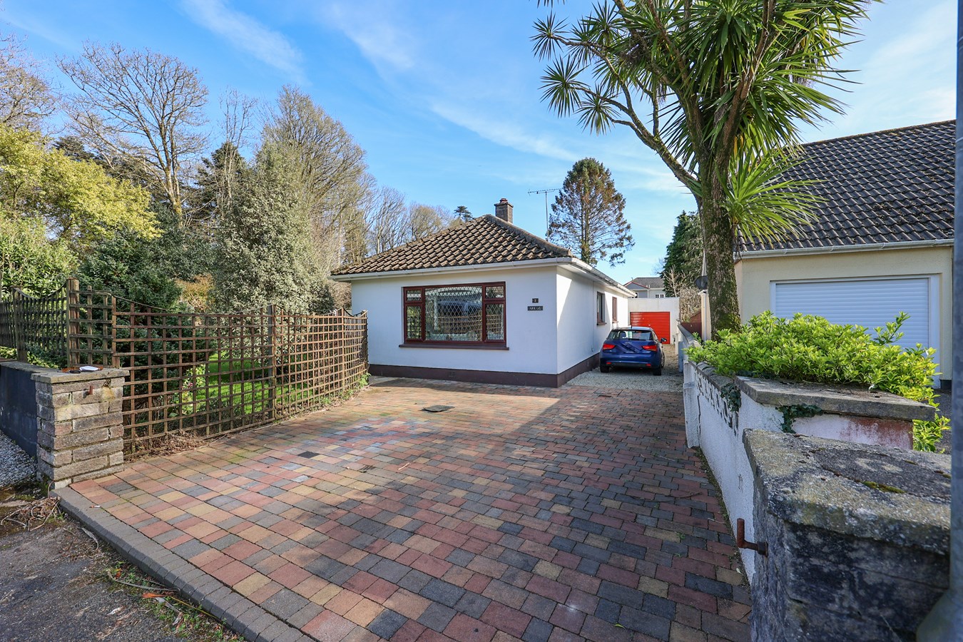 The property is approached via a brick-paved driveway, which extends along the right-hand side and provides direct access to the garage. To the left of the garage, a gated entrance leads into a private, courtyard-style rear garden.