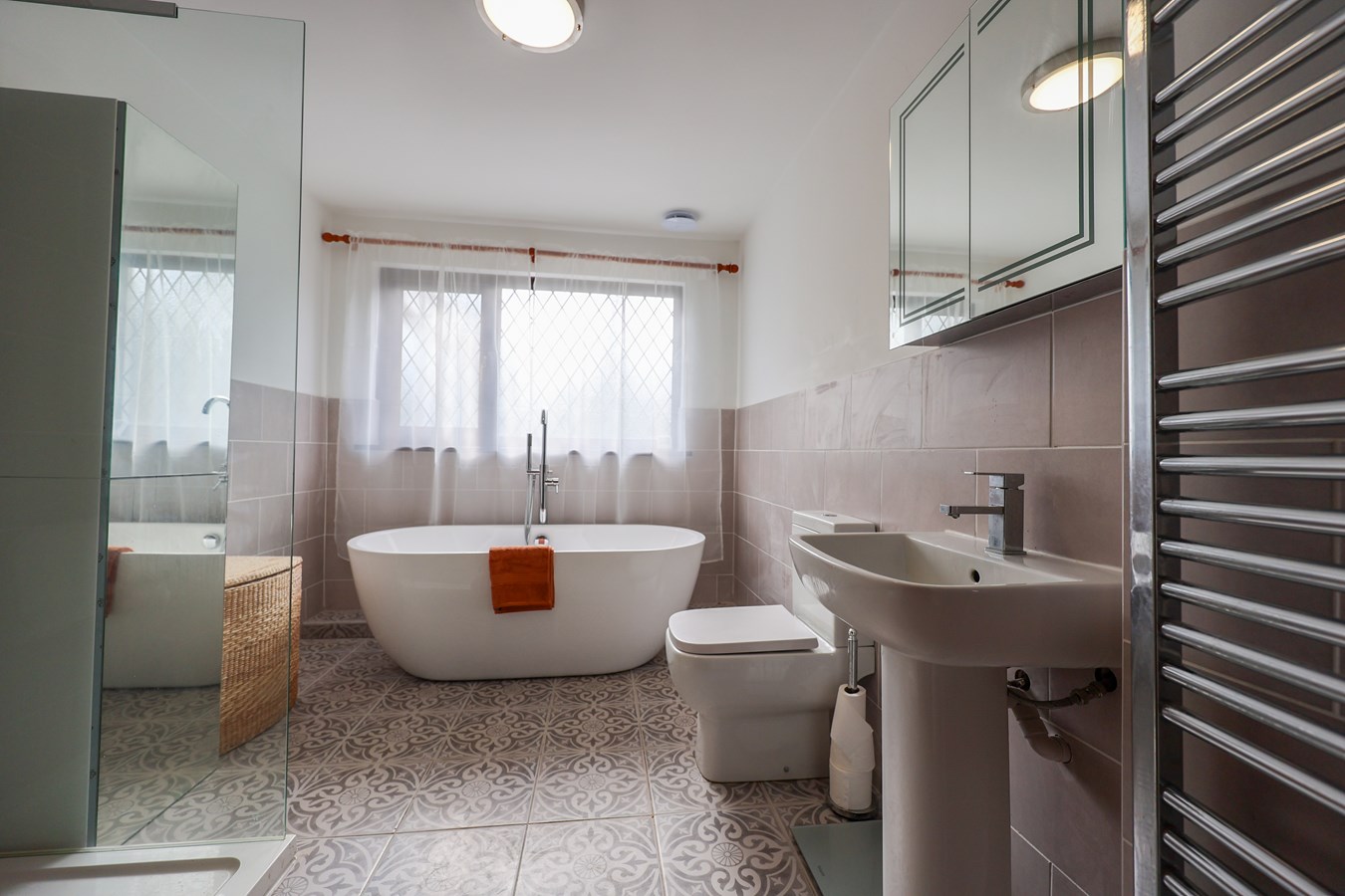 Appointed with a tiled floor and partially tiled walls, the en suite features a built-in mains shower with dual shower heads. Additional highlights include low-voltage lighting, an extractor fan, wash hand basin, low-level WC, and a rear-facing window. A fitted medicine cabinet and heated towel radiator complete this space.